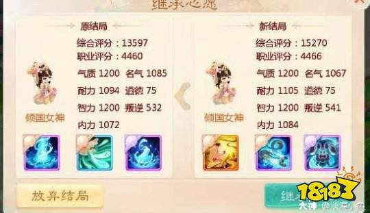大神回答:很多小伙伴心愿模式结局揭晓后想要放弃,但是看到只有继承没有放弃,所以不敢轻易去点。其实先点击继承结局,然后才会出现你之前结局和心愿结局的属性技能对比,以及选择放弃或继承结局如下图,这时候你选择继承或放弃就开局继续开始下一轮的心愿培养了。