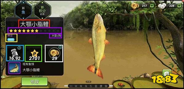 >绿色区域:数字2701,代表了你这条鱼的积分。积分越高,代表你钓起的这条鱼越特别!高积分的鱼,或许可以使你在鱼类排名的排行榜,或者不定期举办的锦标赛里拿下理想的名次,获得奖励噢!