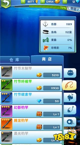 7、在这里我们可以选择更换我们的装备,用金币或者是钻石来购买更好的装备,能够大幅度提升我们钓鱼的成功率