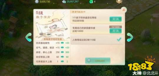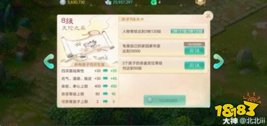 然后等养育等级达到天伦之乐8级的时候就可以养育第三个孩子。养育的条件 a,专属自己的家园豪华度达到20000, b,人物等级达到3转120级, c,2个孩子的命盘宫位等级均达到50级。花费1500万师贡。